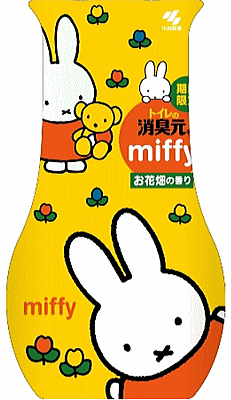 トイレの消臭元 ミッフィー お花畑の香り ●トイレのニオイをしっかり消臭し、香りが長〜く続くトイレ用芳香剤●でっかいろ紙で強力消臭、たっぷり400mL入って効き目長持ち●ろ紙を引き上げるタイプなので消臭・芳香効果を調節できます。●液がなくなる最後まで香りが続きます。●2014年春限定【用途】・トイレ用消臭・芳香剤【使用方法】(1)ミシン目にそってはがす。(2)外キャップをはずす。(3)内キャップを矢印の方向※にまわす。※パッケージ図参照(4)平らな場所に置きゆっくり引き上げる。(5)外キャップをしっかり閉める。【使用期間】・約1.5ヶ月〜3ヶ月間持続します。(香りの持続期間はろ紙の引き上げ高さと使用環境により異なります。)【成分】アミノ酸系消臭剤、香料、界面活性剤(非イオン、陰イオン)、色素【注意事項】・本品は飲めない。・小児の手の届くところには置かない。・安定した場所に置き、倒れたまま放置しない。・外キャップだけを持ち上げない。・こぼれた場合はすぐに拭き取る。・用途以外には使用しない。・直射日光のあたる所、高温の場所に置かない。【応急処置説明】・液体が目に入った場合は、すぐに流水で洗い流す。・ろ紙の調節時や分別廃棄の際、液体が手についた場合はよく洗う。・飲んだ場合は、水を飲ませる。・異常がある場合は本品を持参し、医師に相談する。 小林製薬541-0045 大阪市中央区道修町4-3-6 小林製薬株式会社 お客様相談室06-6203-3625