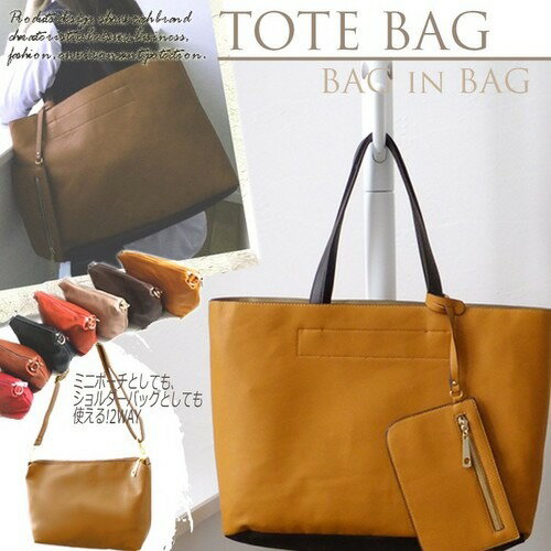 大人気のバッグインバッグ付 トートバックが登場いたしました!!どのデザインよりも、ダントツ人気の商品です!バッグインバッグのポーチはショルダーが付けられる!3WAY♪中は仕切りがないので雑誌もA4ファイルもすっぽり入っちゃう♪【サイズについて】◆幅×高さ×奥行 【BAG約50×30×14cm(底幅41cm)】 【ポーチ約37×18×12cm(底幅27cm)】 【ショルダーは調整可〜】【素材について】フェイクレザー【使用上の注意】【ご確認】特価商品の為、多少傷・ノリの汚れや修正跡等が見られます。在庫限り商品の為、返品・交換は出来ませんので予めご了承の上お買い求め下さい。【発送時期について】◎本日注文3月5日頃出荷予定