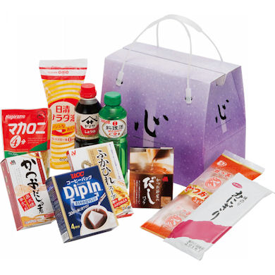 ●日清サラダ油400g・マルトモごまかつおふりかけ(3g×3袋)・かつおぶし(3g×4袋)・純だしパック(3g×6袋)・だしの素(4g×10袋)・白子おにぎり味のり(3切5枚)・ヤマサしょうゆ500ml・日の出料理酒エレガント500ml・DipInまろやかなブレンド4袋・ニチレイコーンポタージュ100g×各1 【アレルゲン:乳・小麦・えび・さば・大豆・鶏肉】 【化粧箱入】 ●箱サイズ 約27.5×18×24cm※のし掛けは致します。包装は商品の形状の特性上出来かねますのでご了承下さいませ。 また、こちらの商品でございますが商品画像通りの手提げ袋入りの商品となっておりますので、お手渡し用の場合も、当店にて手提げ袋のご用意は控えさせて頂いております。何卒宜しくお願い申し上げます。※本商品は商品の形状により、包装する事が出来ません。「のし掛け」の未対応させて頂きますので、あらかじめご了承下さい。また手提げ袋などもつきませんのであらかじめご了承下さい。